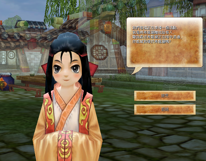 活動一、找到青龍圖! 活動方式: 活動期間內找NPC金香玉接取任務,透過打怪(玩家角色等級 ± 10級),收集任務道具《青龍圖》共24個,回報任務即可獲得經驗值獎勵。 ※此任務每日僅能完成一次。