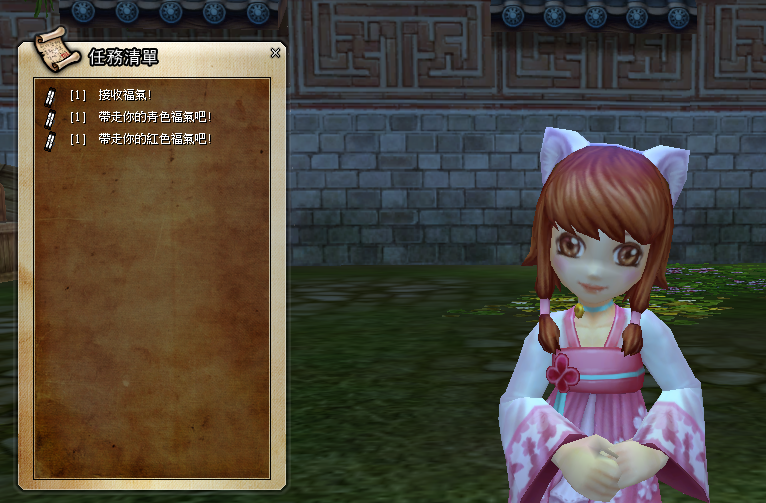 1.接收福氣! 活動方式: 活動期間內找小律接取任務,回報任務即可領取獎勵一次! 活動獎勵:靈獸福袋(活動) ※此任務僅能完成一次。