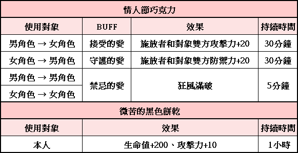 活動四、甜味黑色餅乾 活動方式: 活動期間內找NPC金香玉接取任務,透過打怪(玩家角色等級 ± 10級),收集任務道具《黑色餅乾碎片》共20個,回報任務即可獲得獎勵。 ※獎勵將會根據角色有沒有戀人而有所不同 ※此任務每日僅能完成一次。 【道具獎勵】 有戀人的情況: 情人節巧克力 沒有戀人的情況:微苦的黑色餅乾 ※ 微苦的黑色餅乾只能使用在本人的角色上,並無法和部分道具疊加使用。