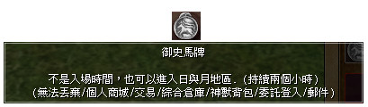 活動時間:2021/9/16(四) 維護後 ~ 2021/9/30(四) 維護前 活動對象:等級達35以上的角色 依據不同轉職支付固定費用後,即可獲得 日與月村莊的入場券『御史馬牌』