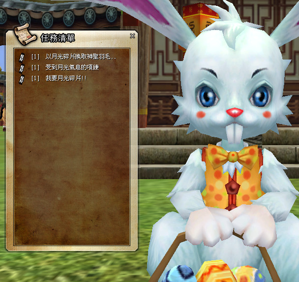 三、吃月餅的月兔! 活動方式:背包有靈獸月兔(活動)時,活動期間內找小律對話,支付2億遊戲幣並完成任務,就能交換成特別的靈獸月兔 活動獎勵:靈獸月兔(特)(活動) ※此任務僅能完成一次