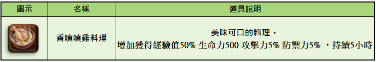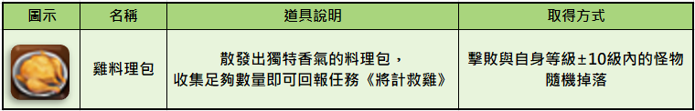 向NPC巨雞接取任務《將計救雞》,透過打怪(玩家角色等級 ± 10級),收集任務道具《雞料理包》30個,收集任務道具後,回去找NPC繳交任務道具,完成任務後可獲得獎勵buff《香噴噴雞料理》。 《香噴噴雞料理》獲得效果: