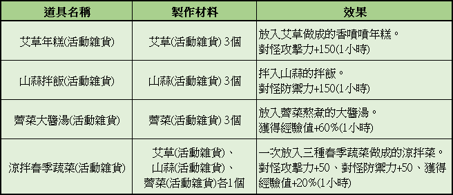 活動三、春季蔬菜特殊製作 活動方式:活動期間內可使用《艾草(活動雜貨)》、《山蒜(活動雜貨)》、《薺菜(活動雜貨)》進行特殊製作可合成不同效果的buff道具 buff道具內容如下: