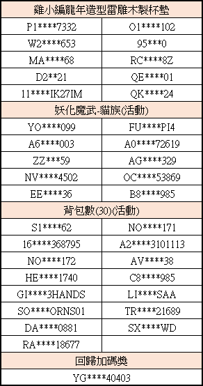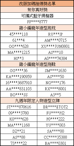 | 『改版加碼抽大獎』得獎名單公佈!! 2024.08.13 16:10 |