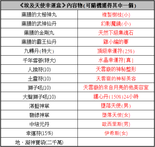 ►百寶閣限時上架: (販售時間2020/5/28 維護後 ~2020/6/11 維護前) 埃及天使幸運盒 售價48元