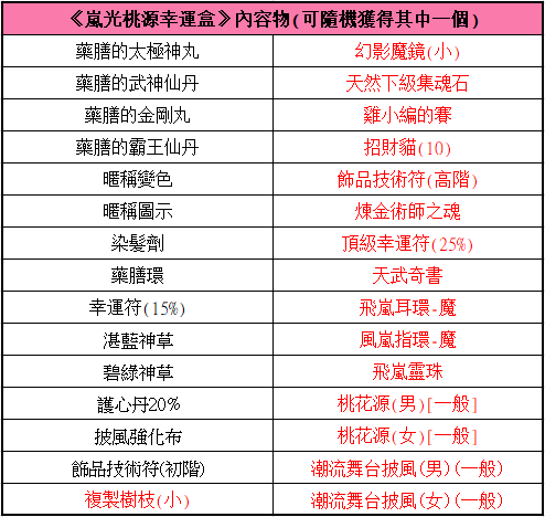 ►百寶閣限時上架: (販售時間2021/6/10 維護後 ~2021/6/24 維護前) 嵐光桃源幸運盒 售價48元