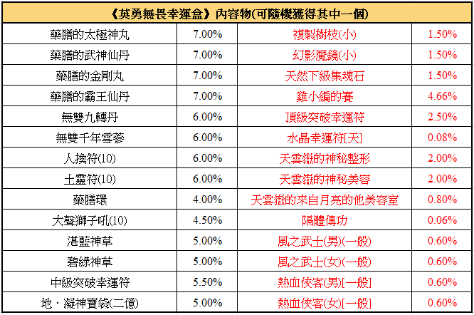 1.實際功能以遊戲內容為主,樂意傳播保留最終解釋權。 2.活動期間如因不可抗拒主體、系統狀況或其他任何問題等導致活動無法進行,樂意傳播股份有限公司保留終止、修改活動內容及相關規定條款之權利,變更事項以遊戲網站中說明為準。 3.購買幸運盒道具後,請盡快使用完畢,避免因遊戲資料更新而造成資料異常。 4.幸運盒道具可獲得中獎商品,消費者購買或參與活動不代表即可獲得特定商品。 5.玩家如因個人線路不穩定,導致斷線、連線失敗等問題,本公司均不負責,活動亦將照常進行,不另外做補償。 6.活動積分將統一於每年三月、六月、九月、十二月的最後一周維護日自動恢復,請於恢復前使用完畢,被恢復的活動積分將不予補發。 |