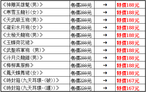 ※結束遊戲時,請於遊戲中按[結束遊戲],並依系統等待時間自動關閉遊戲, 以免造成遊戲資料遺失。 ※購買幸運盒道具後,請儘速使用完畢,避免因遊戲資料更新而造成資料異常。 ※幸運盒道具為機會中獎商品,消費者購買或參與活動不代表 即可獲得特定商品。 ►百寶閣特價即將結束商品: