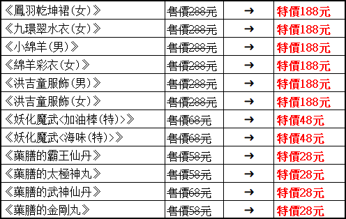 ※結束遊戲時,請於遊戲中按[結束遊戲],並依系統等待時間自動關閉遊戲, 以免造成遊戲資料遺失。 ※購買幸運盒道具後,請儘速使用完畢,避免因遊戲資料更新而造成資料異常。 ※幸運盒道具為機會中獎商品,消費者購買或參與活動不代表 即可獲得特定商品。 ►百寶閣特價即將結束商品: